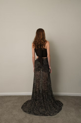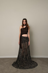 Cut from a flowy chiffon fabric, this asymmetrical one shoulder top wraps softly across the body, creating a sculptural silhouette. The extended tie by the neck can be tied in different ways, offering versatile styling — from a sleek scarf wrap-around to a freeform drape. Its deep chocolate tone adds understated sophistication, making it easy to pair with both tailored and relaxed bottoms.