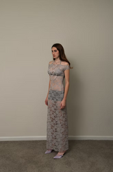 A sheer floor length gown crafted from delicate grey floral lace. The translucent construction creates an ethereal effect, while the fitted silhouette gently follows the body’s curves. Lookbook paired with mesh bralette and grey booty shorts. The dress is designed to be layered, offering a bold balance between romantic softness and contemporary sensuality.