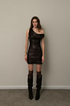 Crafted from coated spandex with a high-shine finish, this mini dress hugs the body in a sleek, sculptural silhouette. The neckline allows versatile styling—worn off one shoulder for sensual elegance, or adjusted higher on both shoulders for a modern edge. The liquid-like sheen adds a bold, futuristic touch while the fitted cut emphasizes natural curves, making it a statement piece for night outings and elevated occasions.