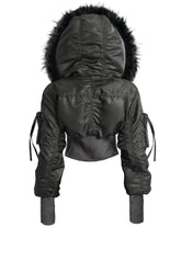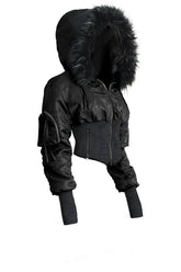 A structural masterpiece that merges the rugged DNA of an N-3B parka with the sharp, feminine lines of traditional corsetry. The KIMYO Voline Padded Bomber Jacket features an exaggerated, oversized faux-fur hood and voluminous gathered sleeves, contrasted sharply by a high-compression ribbed knit corset waist.