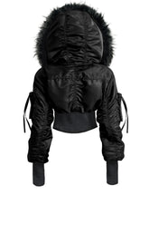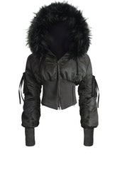 • Exaggerated Hood: Oversized hood with premium high-density black faux fur trim.